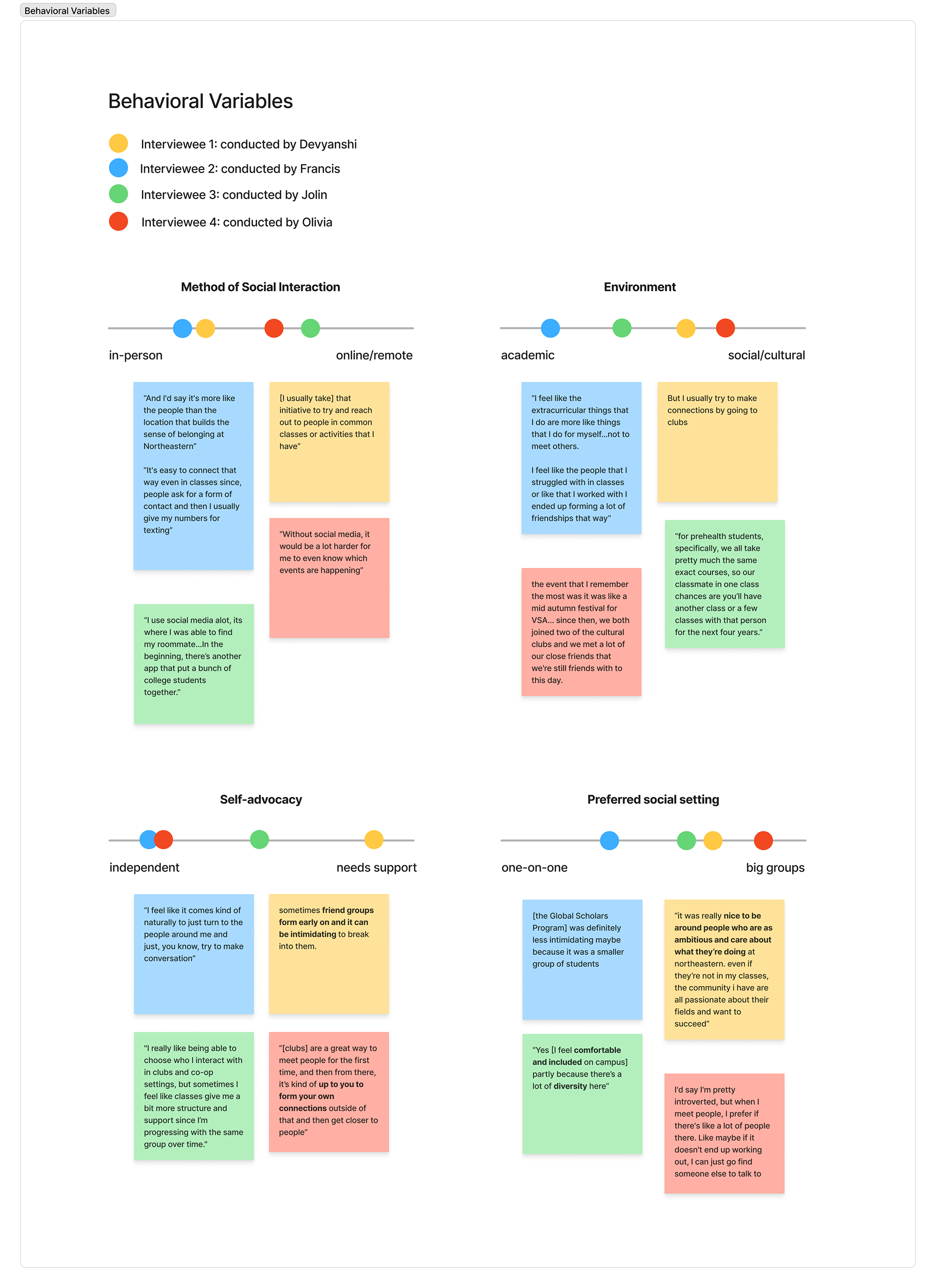 Our interviews highlighted that belonging at Northeastern isn’t about the number of programs or resources but rather about how easy it feels to make and maintain meaningful relationships. Students crave genuine connection, but many feel that they have to work hard to find it. Those in smaller, more structured groups (like Global Scholars) seemed to form friendships more naturally, suggesting that forced proximity and repeated interaction can make a big difference. Students also expressed a clear interest in technology that could help them connect socially in a more personal way. Academic tools like Piazza feel too formal, and platforms like LinkedIn feel too superficial. One student even suggested creating a Northeastern-specific app that helps students find others with similar interests, classes, or living situations; one that was more casual and community-focused.