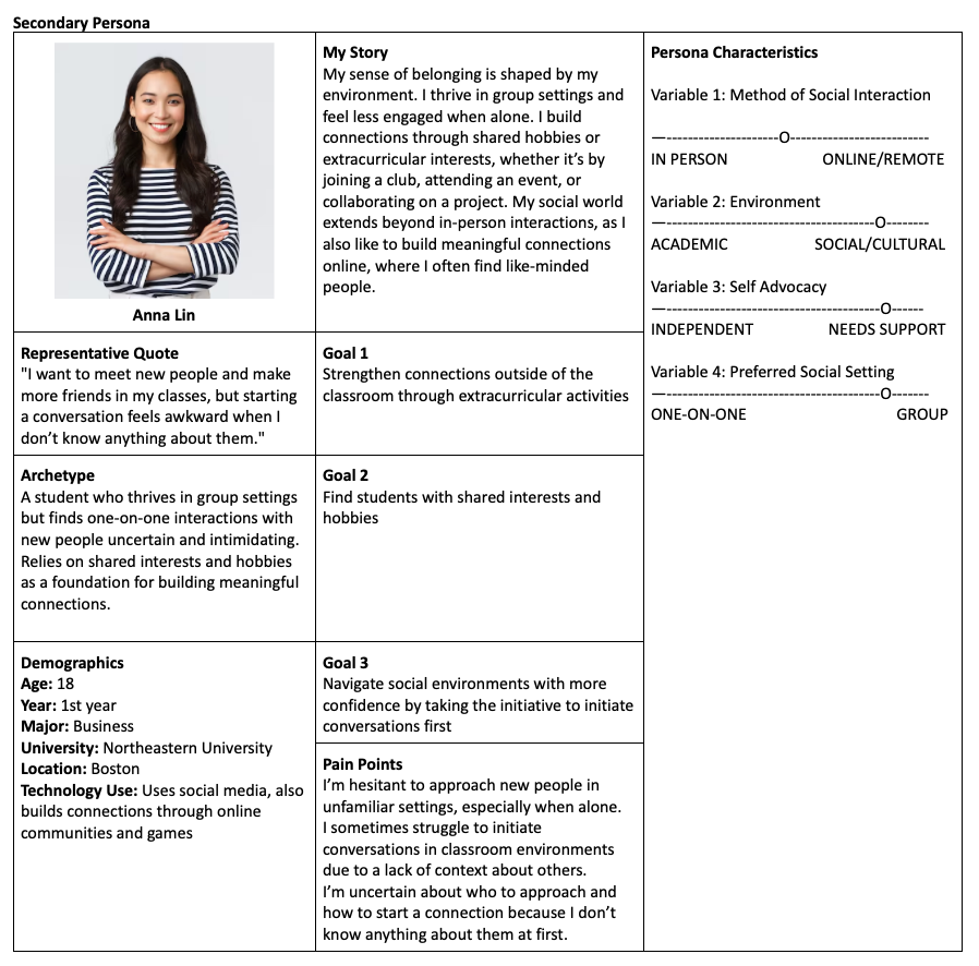 We looked into how students, especially first-gen, low-income, or international students, use digital tools to try and find support. We found that while there are apps aimed at reducing loneliness or promoting connection, they fall short of helping students truly find their place. These gaps show there’s an opportunity to design something better: something that’s not just another social platform, but a space where students can connect authentically, share experiences, and build a real sense of belonging.